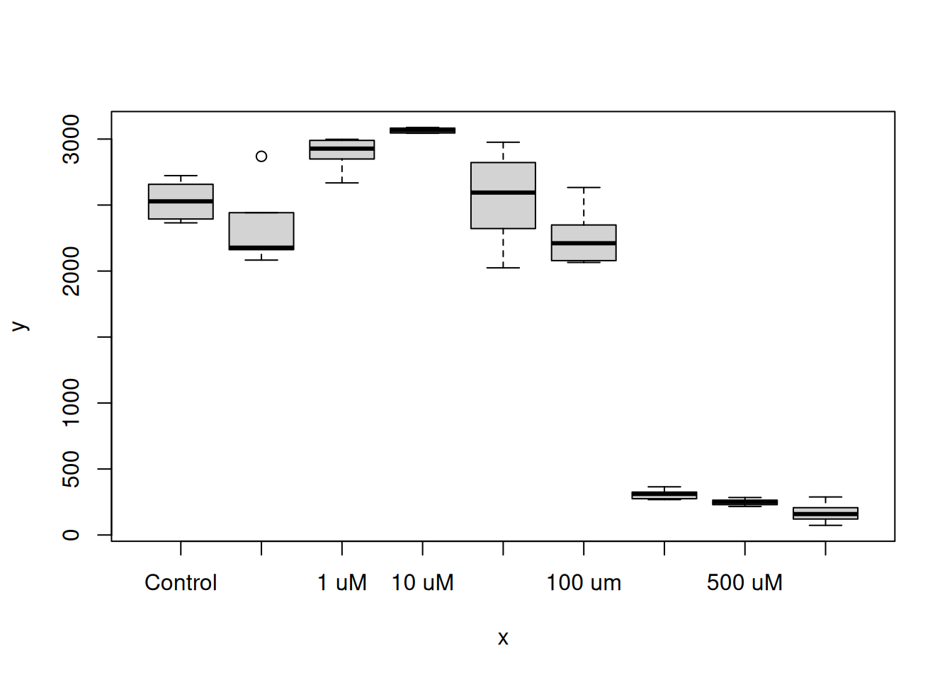 Lets compare the group means of the different doses to see if there is any significant differences! An Analysis of Variance (ANOVA) analysis will tells us if there is a difference between the tested groups, but not between which. For this we run a post-hoc (lat. after this) test. The Tukey-Kramer test is post-hoc test that will tell us between which groups there is a difference.