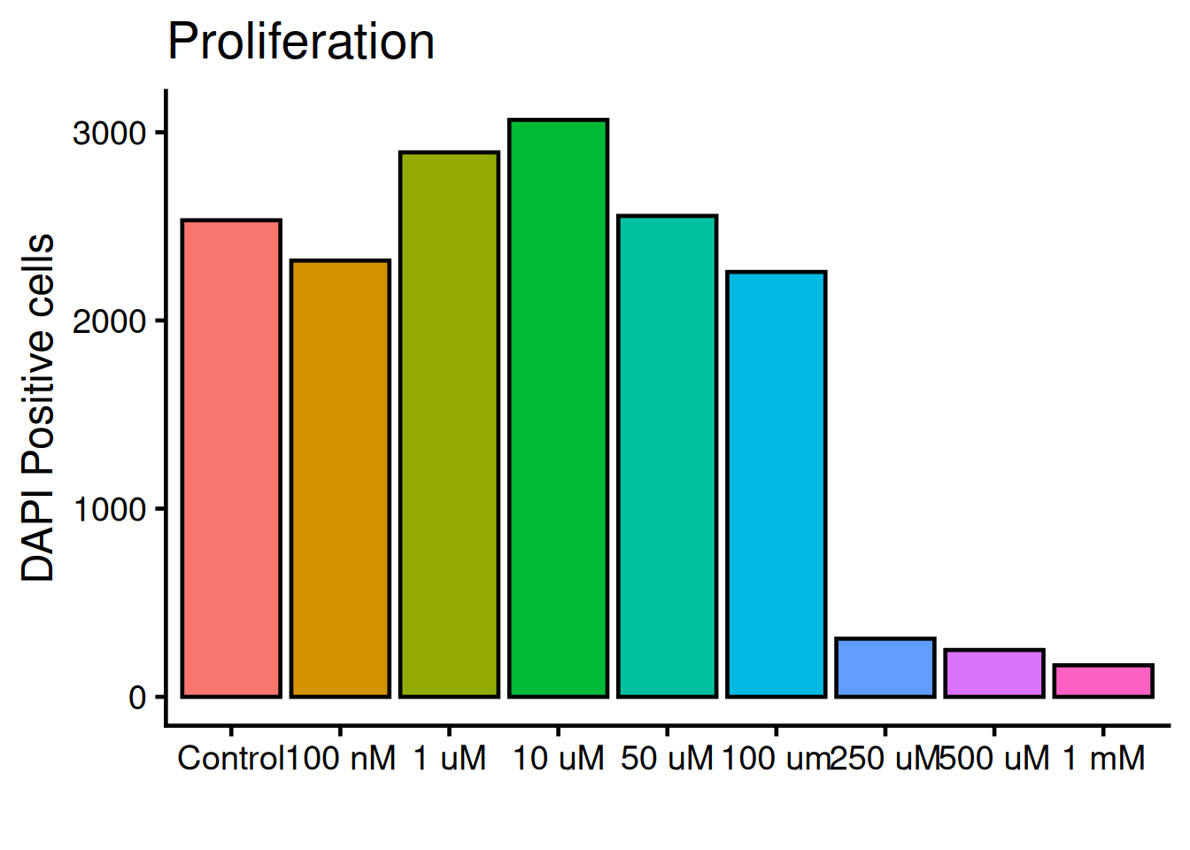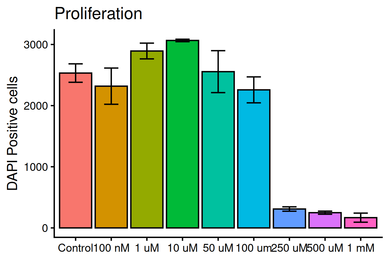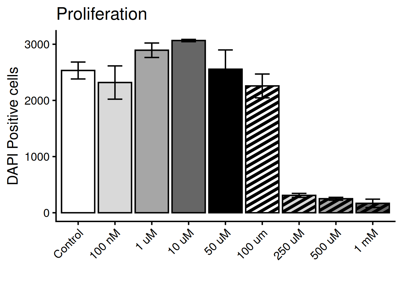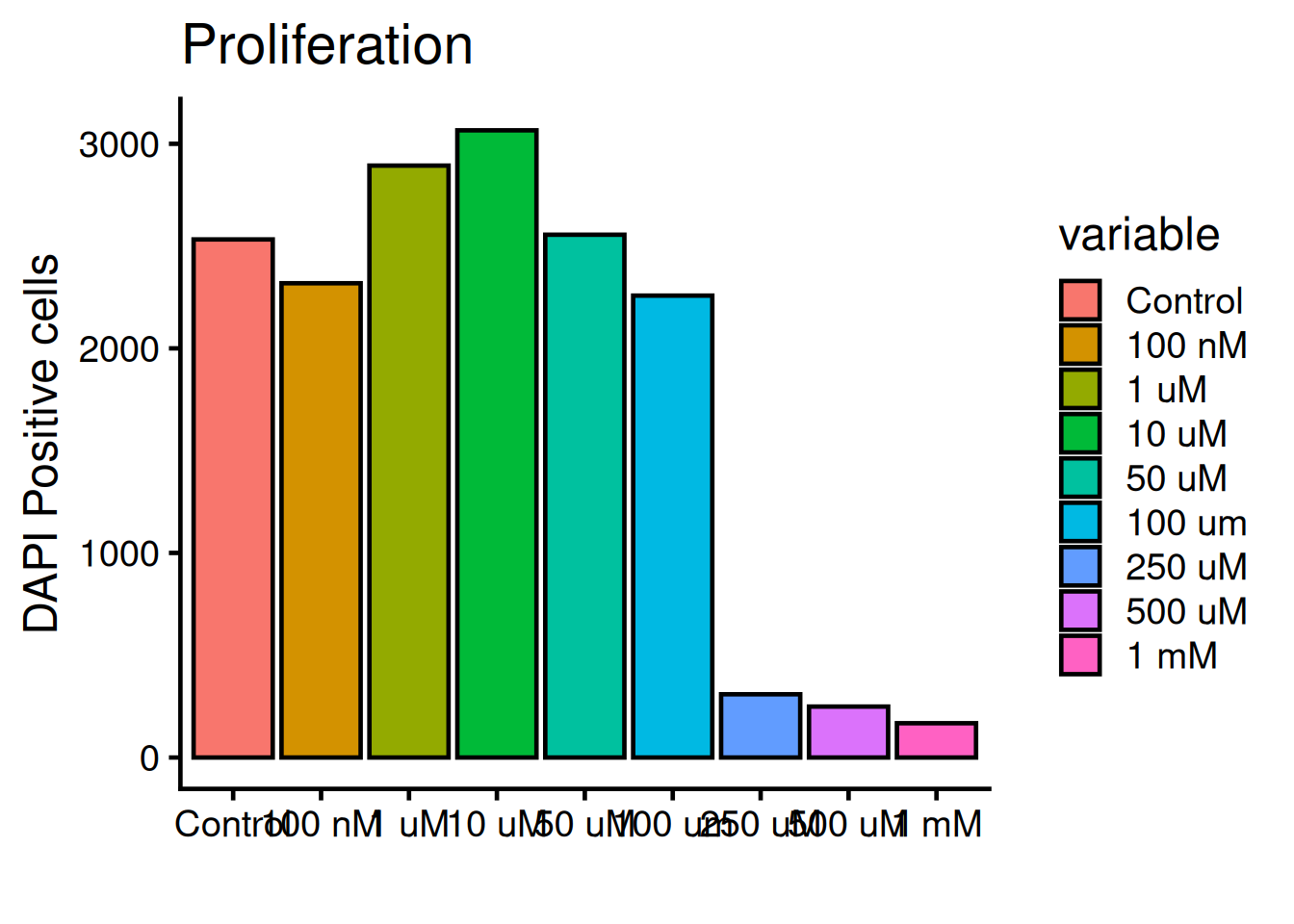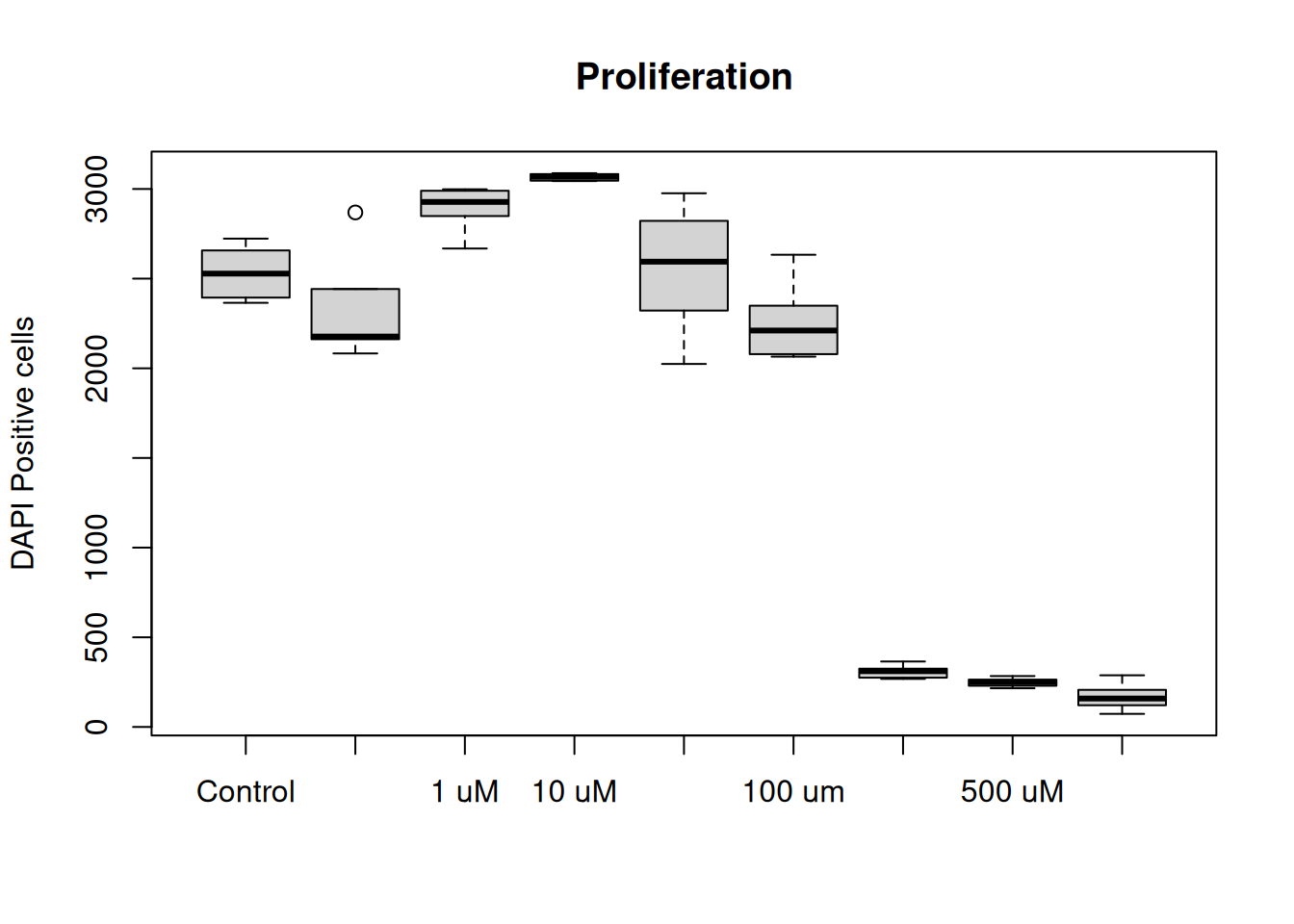 Here, we will reproduce the statistics and the figure 1F. This figure shows the proliferation phenotype over mulitple doses of 72h PFOS exposure. Proliferation is measured by quantifying the cell nuclei with DAPI, a staining method.